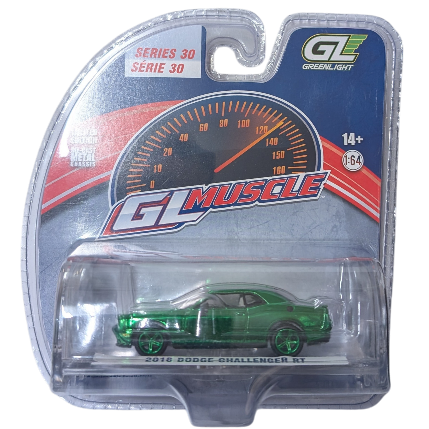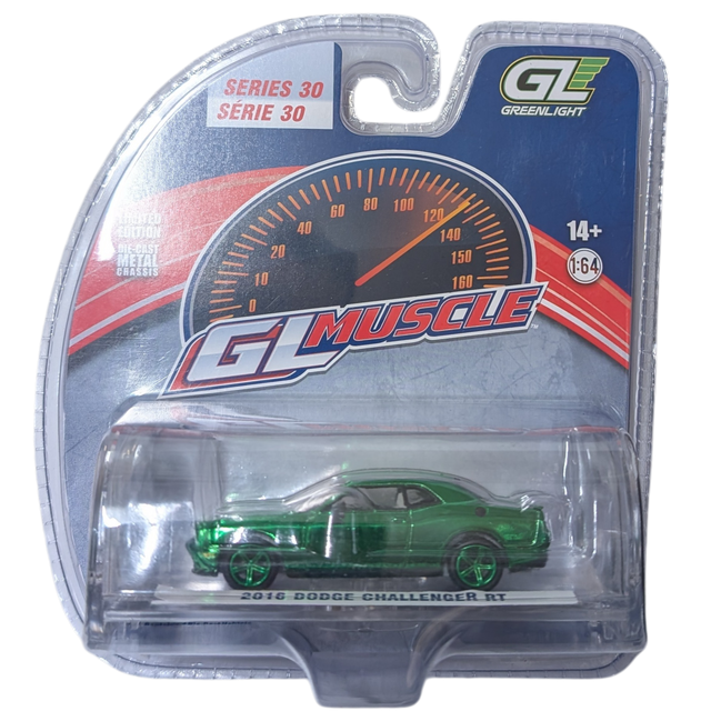 CHASE VERSION: Green Chrome 2016 Dodge Challenger RT, GL Muscle Series 30, 1:64 Scale Diecast Car