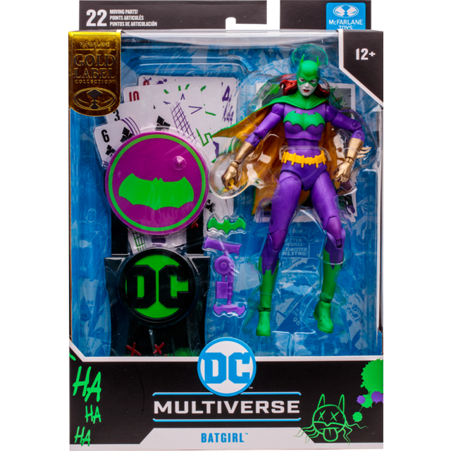 Dive into the DC Multiverse with the Batgirl (Jokerized) 7" Scale Action Figure from McFarlane Toys' Gold Label collection. This incredibly detailed figure, standing at 7 inches, offers Ultra Articulation with up to 22 moving parts, providing a full range of posing and play possibilities. Batgirl is uniquely adorned with a "JOKERIZED" deco, adding a sinister twist to her iconic look. The figure comes complete with Jokerized accessories, including a Batarang, grapple launcher, art card, 4 playing cards, collector card holder, and a display base.