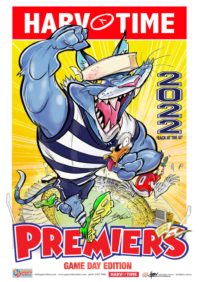 Geelong Cats 2022 AFL Premiers GAME DAY Harv Time Poster is backordered and will ship as soon as it is back in stock.