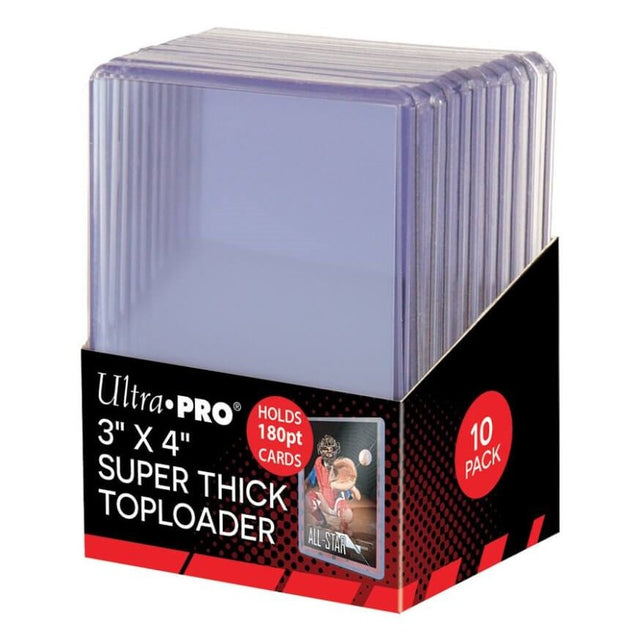 Protect your valuable trading cards with Ultra PRO’s super clear, 3″ x 4″ “Super Thick” Toploaders for standard sized cards up to 180pt thickness. These rigid PVC plastic holders encloses the card and keeps it clean while preventing damage. Each pack comes with 10 individual pieces.