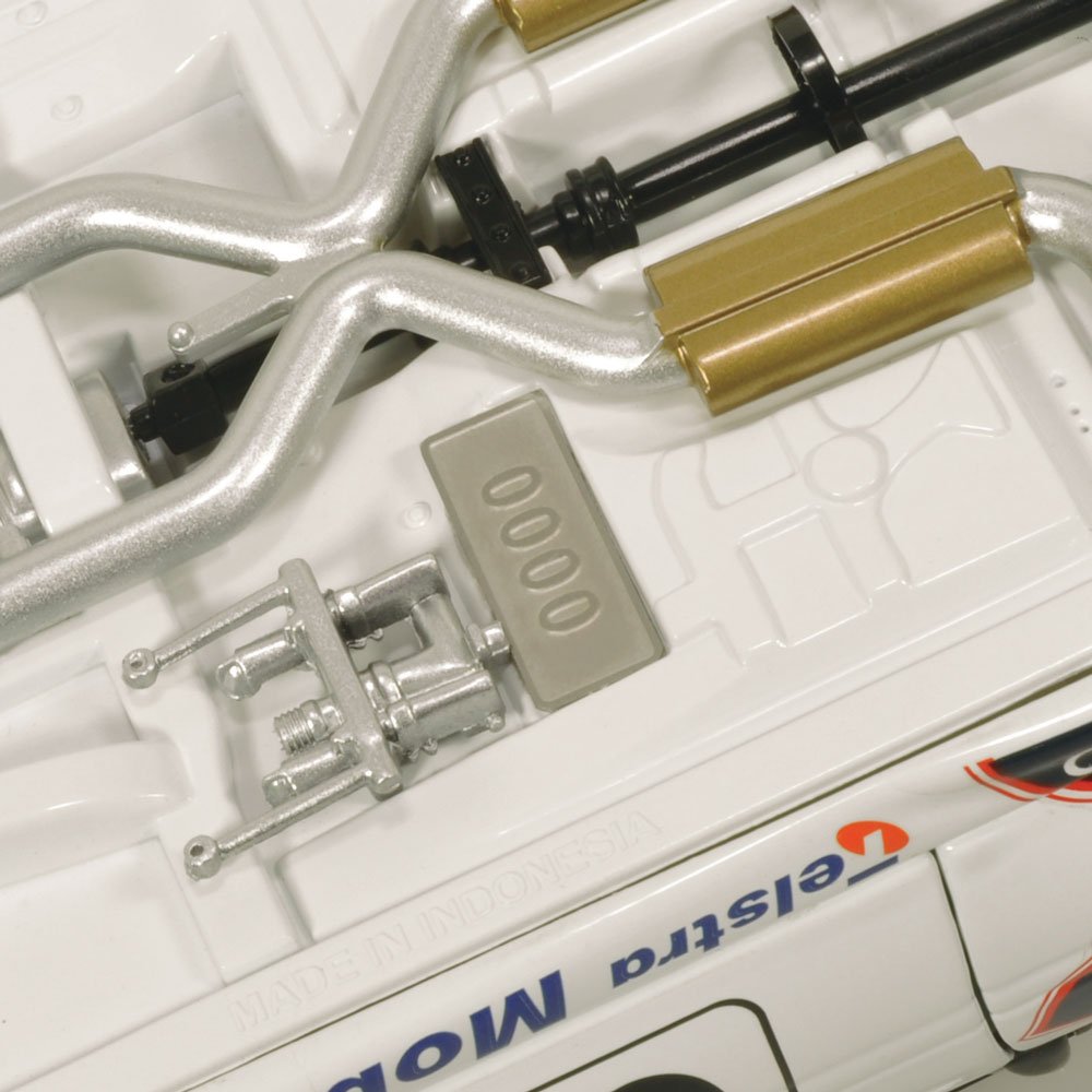 - Superb chassis detail with working suspension and steering, oil setup, hosing, anti-roll bar gearbox, flywheel and exhaust manifolds are shown here.