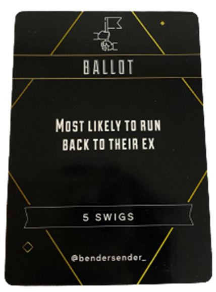 Ballot Whoever gets the most votes throughout the group must take the amount of swigs listed on the