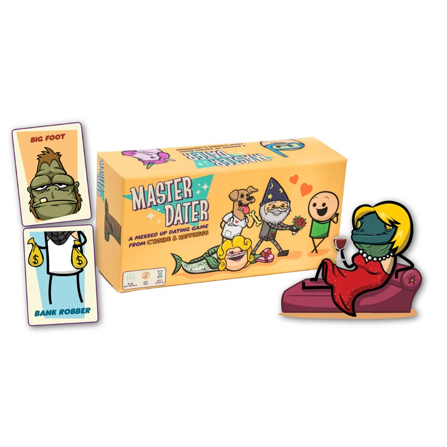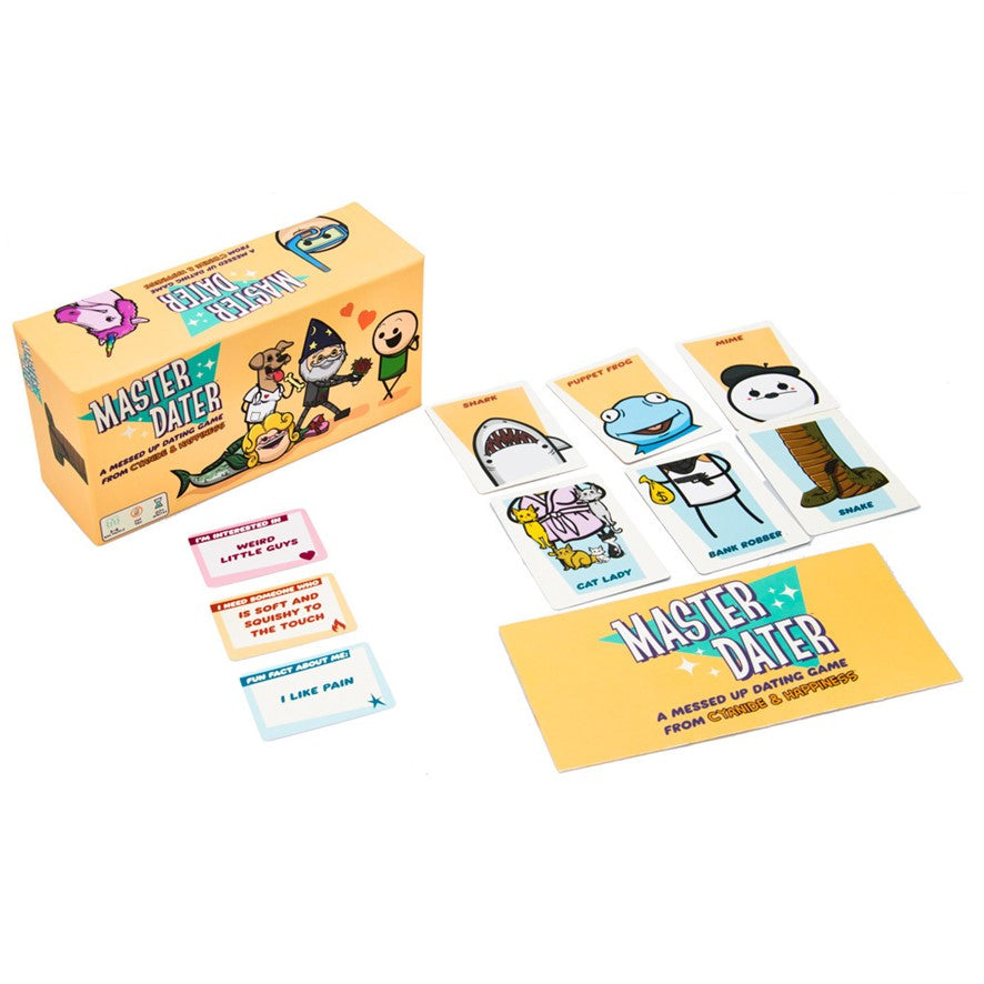 In Master Dater, the messed-up dating game, players take turns being the sexy single. Other players then combine heads and bodies to make messed-up dates to pander to three unusual interests of the single. The single then awards the player or players who best argued their case with heart, love, and flame cards.