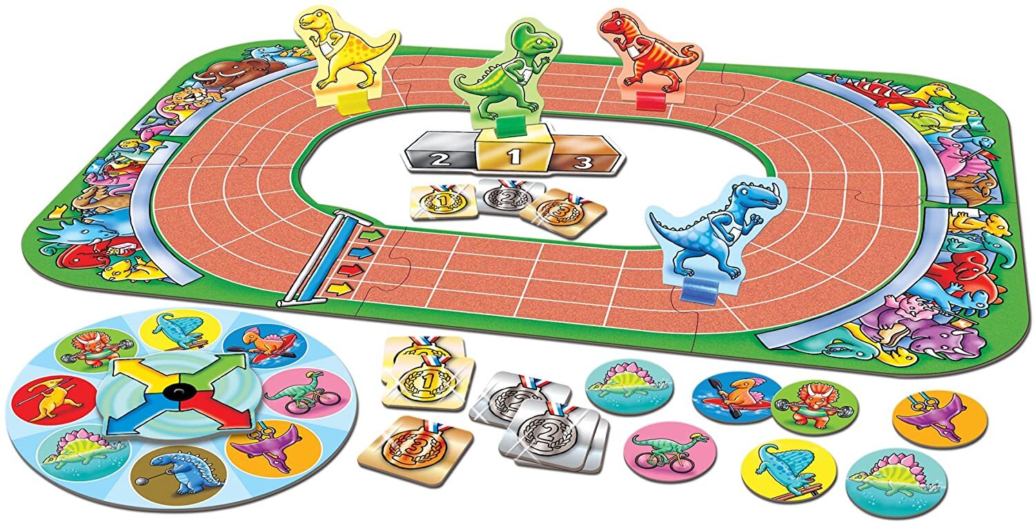 Race for your position on the podium to collect a shiny medal! In this exciting game of chance, all the dinosaurs move simultaneously towards the finish line to collect a bronze, silver or gold medal! Players take it in turns to spin the four ended spinner, which tells each player which dinosaur cards to look out for on the table. Everyone must then count up the matching cards and move this many spaces along the track. Who will race into the lead?