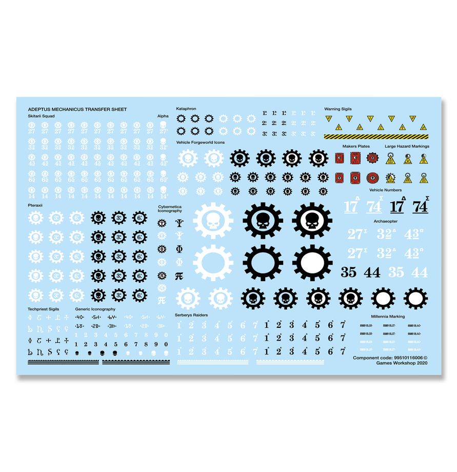 Each Adeptus Mechanicus Transfer Sheet features 320 high-quality waterslide transfers. These include Mechanicus symbols, along with warning sigils, numbers, and more to decorate your miniatures.
