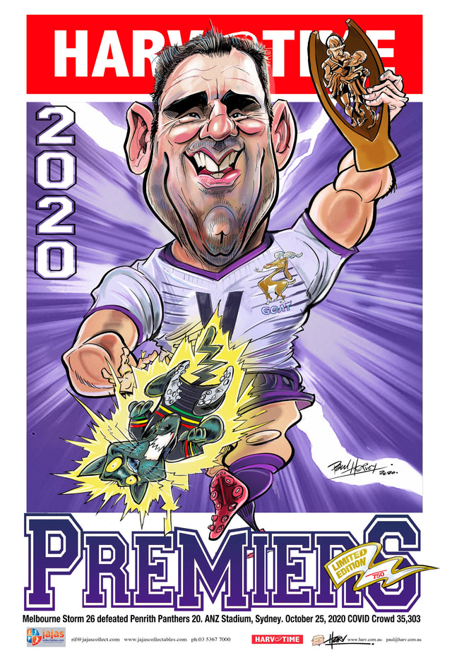 Melbourne Storm 2020 NRL Premiers Harv Time Poster, White Jersey is backordered and will ship as soon as it is back in stock.