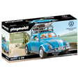 The playset contains three PLAYMOBIL figures, a Volkswagen Beetle by PLAYMOBIL with roof rack, removable roof and tailgate that can be opened, surfboard, cool box, sand toys and many other accessories.