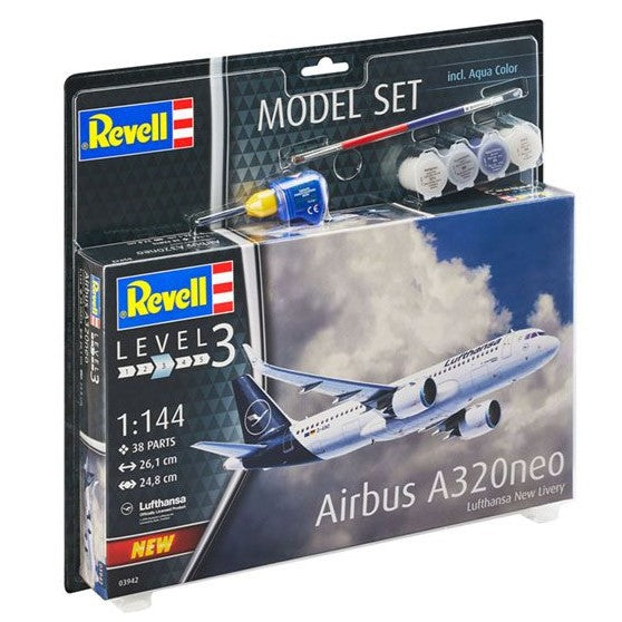 Airbus has updated its short and medium haul family of passenger aircraft the with the A320neo. - Cockpit - Detailed engines - Display stand - Decal set for the Lufthansa "New Livery" version In addition to basic colours, adhesives and brushes are also included.