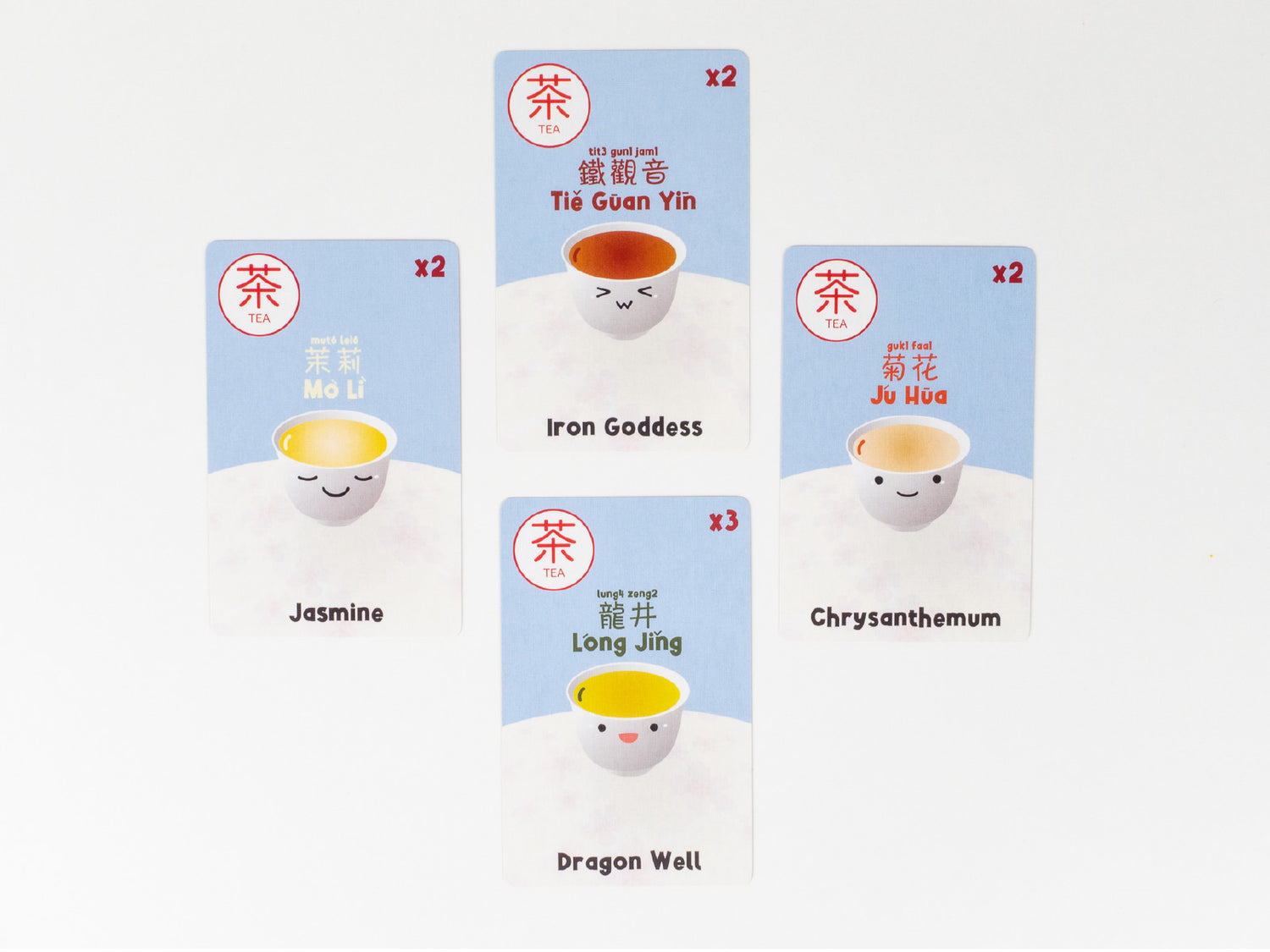 A round of Yum Cha ends when a player draws the eleventh card which makes a complete hand, revealing 3 sets of dim sums and 1 pair of tea. When they do so, they announce Yum Cha! and the round ends. A set of dim sums consists of three unique dim sums from the same tier. Duplicate dim sums cannot form a part of a set. A pair of tea consists of two tea cards of the same flavour.